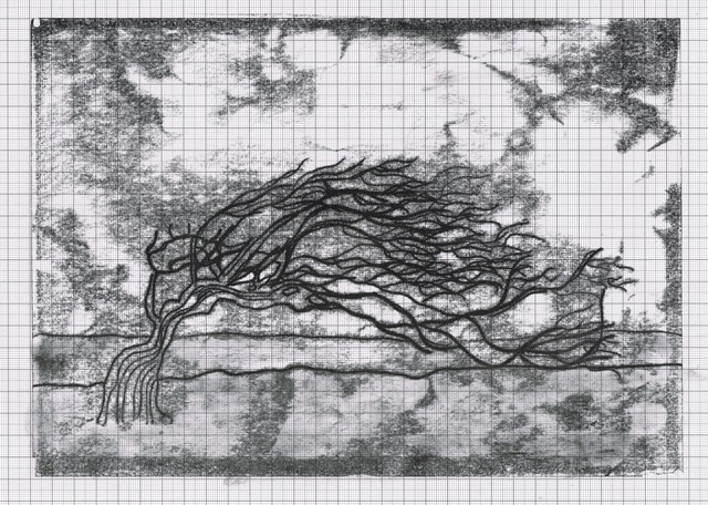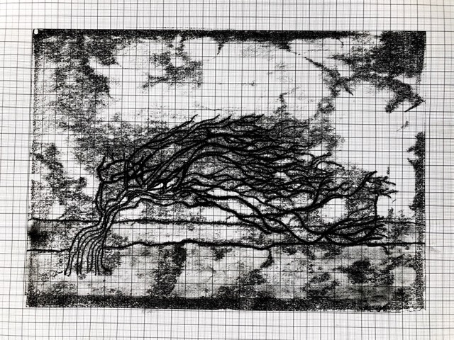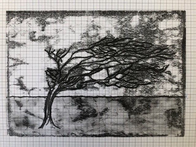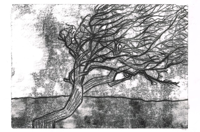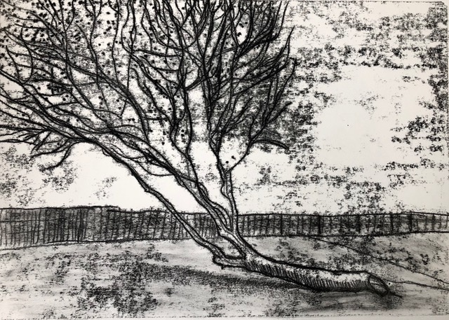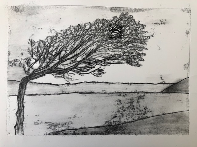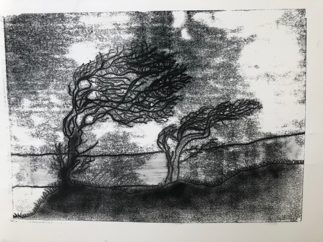 Jachelt is an old Scottish word meaning buffeted, blown about or over by the wind. These are all mono prints of trees that have grown in the direction of the wind. The brief was ‘movement’ and I liked the idea of trying to show movement using something so solid and still as a tree. As we were in lockdown I took some ideas for these images from the internet, so many thanks to the original photographers. One of these trees has not been bent by the wind, but by school children sitting on the trunk. Lovely to think of them all sitting there chatting away.