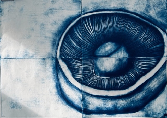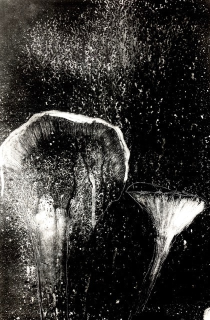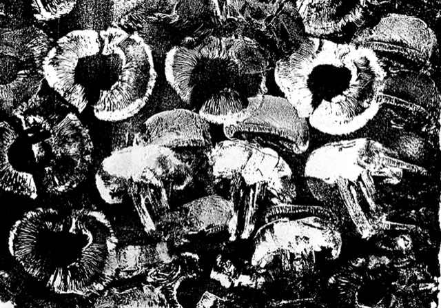 Plath also uses the line ‘We diet on water, On crumbs of shadow.’ Wanting to avoid the cute, anthropomorphised Disney image of mushrooms from ‘Fantasia’, I decided to represent their shadowy existence, by making my own mushrooms dark and tenebrous in nature.