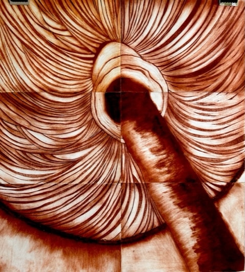 These mushrooms represent a time after the poem. Beyond “Our foot is in the door,” when they have become large, powerful and strong, pushing through, occupying space, demanding a place in the world.