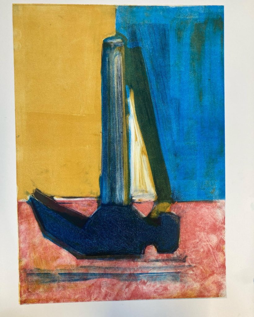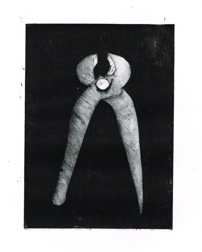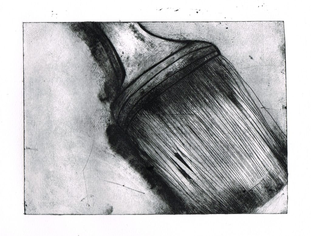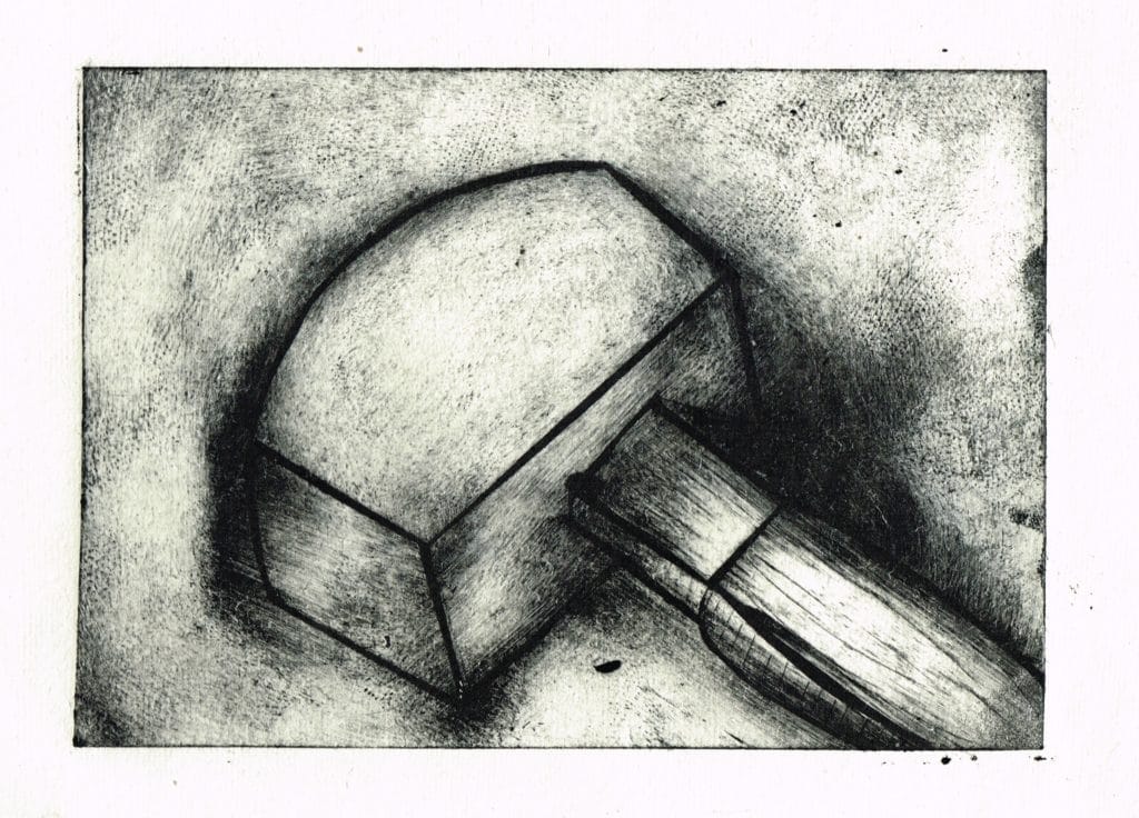 This is a series of prints I have made about my dad’s tools. When my dad died I had to sort out his house. Unfortunately unbeknown to me there had been a large hole in the roof of my dads shed and by the time it was discovered his treasured toolbox was waterlogged and the tools sitting in a rusty stew. I decided to let the tools go because I didn’t know what else to do and was too grief stricken to think of an alternative at the time. I regret that decision now because I think tools are such beautiful objects and so cleverly made for a particular purpose which they perform perfectly. They represent such skill and labour which are admirable qualities. These prints are made from memory, and represent the vagueness of that memory. They are not meant to be detailed images of the tools but an attempt to capture the feel of them in my hand, their weight, and the coldness of the steel or warmth of the wood. They try to show the many strikes of the hammerer and the sweeps of the pasting brush, in order to show how hard my dad worked to make everything better for us.