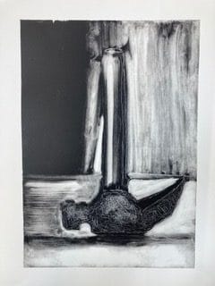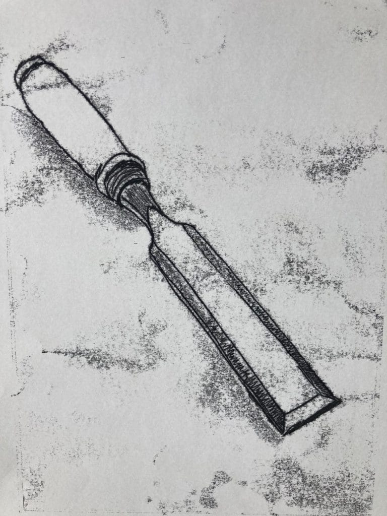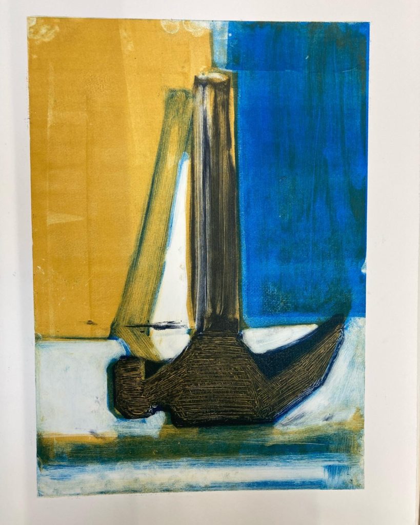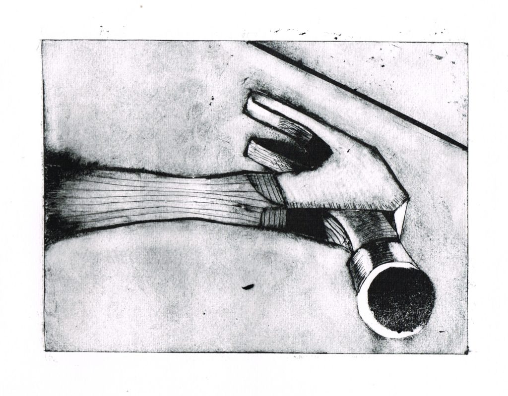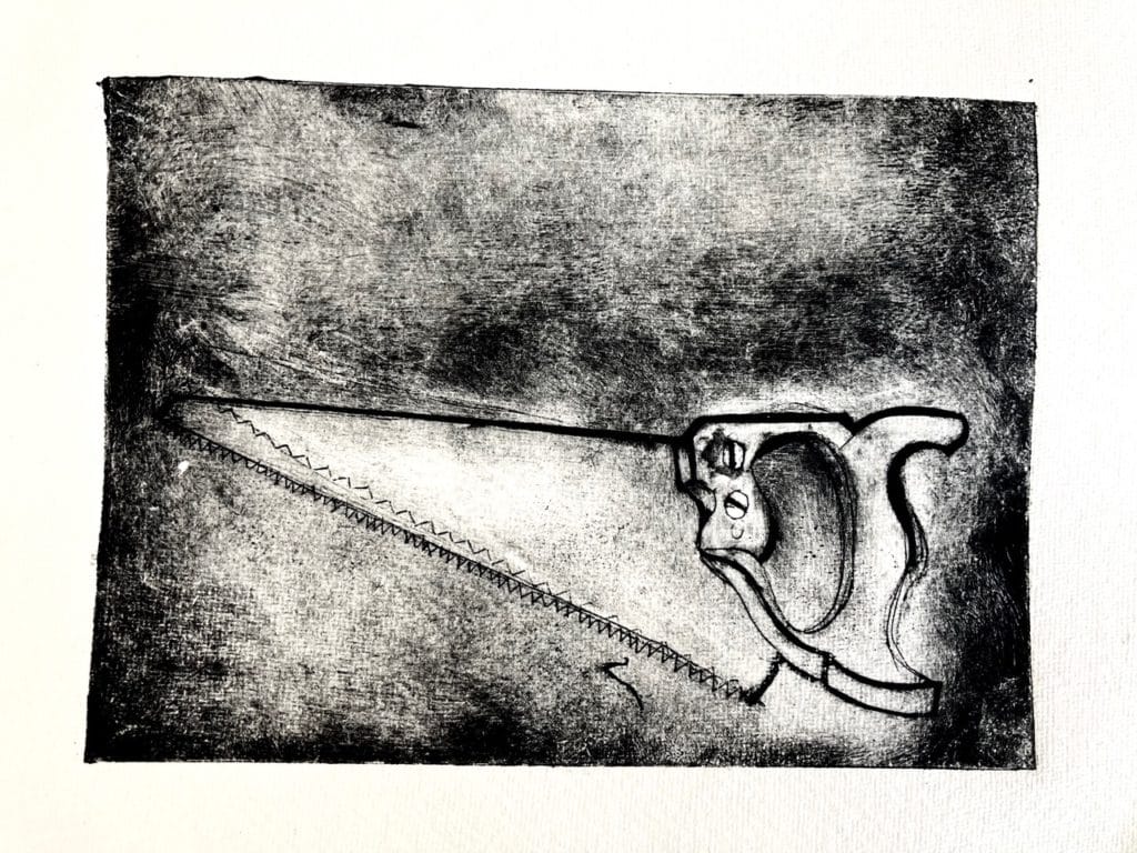 This is a series of prints I have made about my dad’s tools. When my dad died I had to sort out his house. Unfortunately unbeknown to me there had been a large hole in the roof of my dads shed and by the time it was discovered his treasured toolbox was waterlogged and the tools sitting in a rusty stew. I decided to let the tools go because I didn’t know what else to do and was too grief stricken to think of an alternative at the time. I regret that decision now because I think tools are such beautiful objects and so cleverly made for a particular purpose which they perform perfectly. They represent such skill and labour which are admirable qualities. These prints are made from memory, and represent the vagueness of that memory. They are not meant to be detailed images of the tools but an attempt to capture the feel of them in my hand, their weight, and the coldness of the steel or warmth of the wood. They try to show the many strikes of the hammerer and the sweeps of the pasting brush, in order to show how hard my dad worked to make everything better for us.